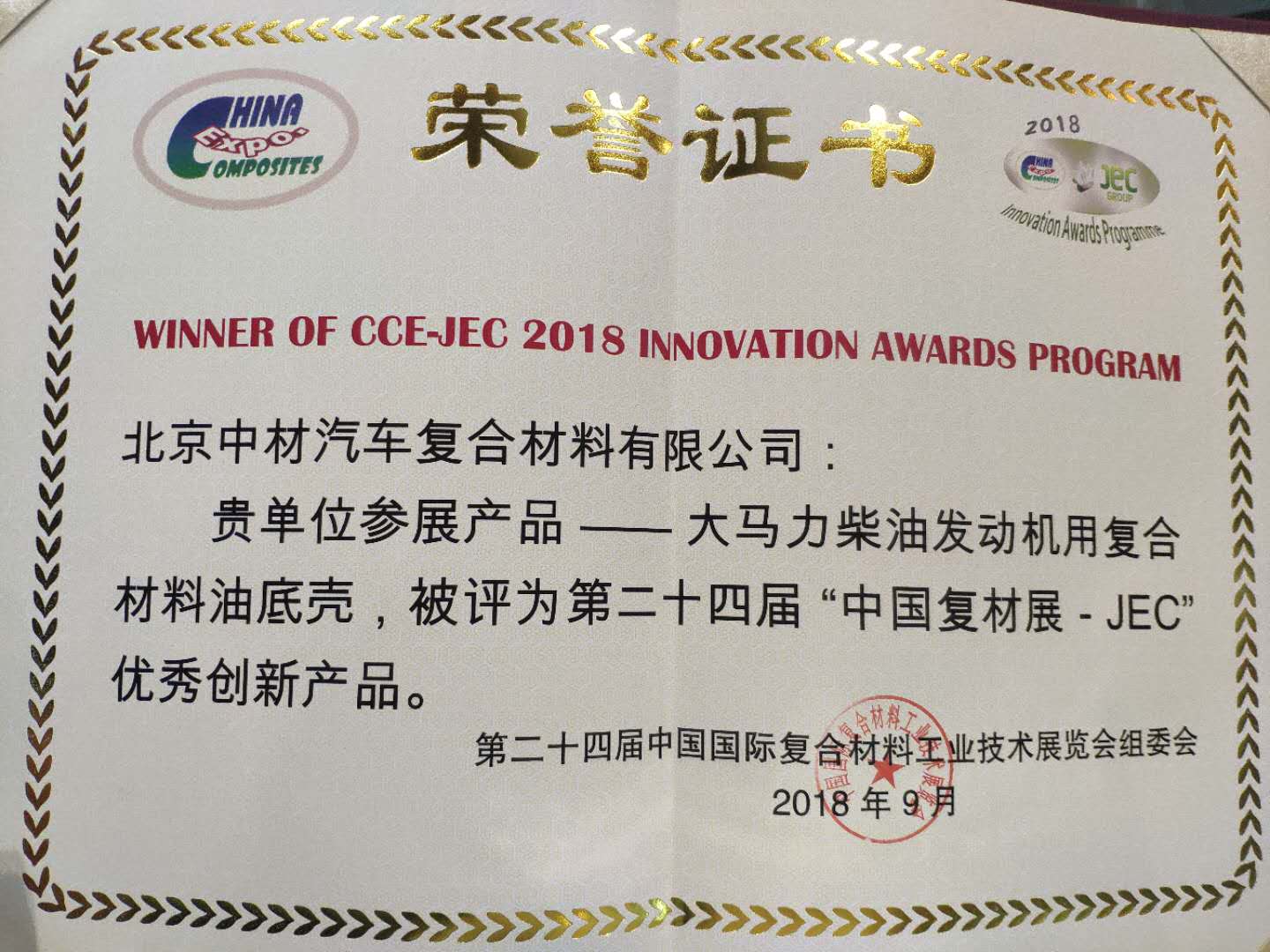 9月5日上午11點,在2號展館新聞發(fā)布區(qū)進行2018CCE-JEC創(chuàng)新產品頒獎儀式,來自國內外33家企業(yè)的42件創(chuàng)新產品角逐原材料、應用、工藝與技術三大類十余項大獎。中材科技風電葉片股份有限公司的參展產品“75-6.7MW海上抗臺風型大葉片”、北京中材汽車復合材料有限公司參展產品“大馬力柴油發(fā)動機復合材料油底殼”兩項產品評為第二十四屆“中國復材展-JEC”優(yōu)秀創(chuàng)新產品獎。公司董事長薛忠民參加頒獎儀式。